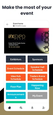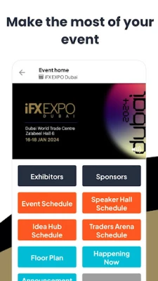 • Match with Potential Clients or Buyers • Schedule Meetings and Exchange Messages • Navigate the Floorplan and Event Agenda • Explore Profiles of the Sponsors, Exhibitors, and Attendees Get the maximum of what iFX EXPO has to offer!